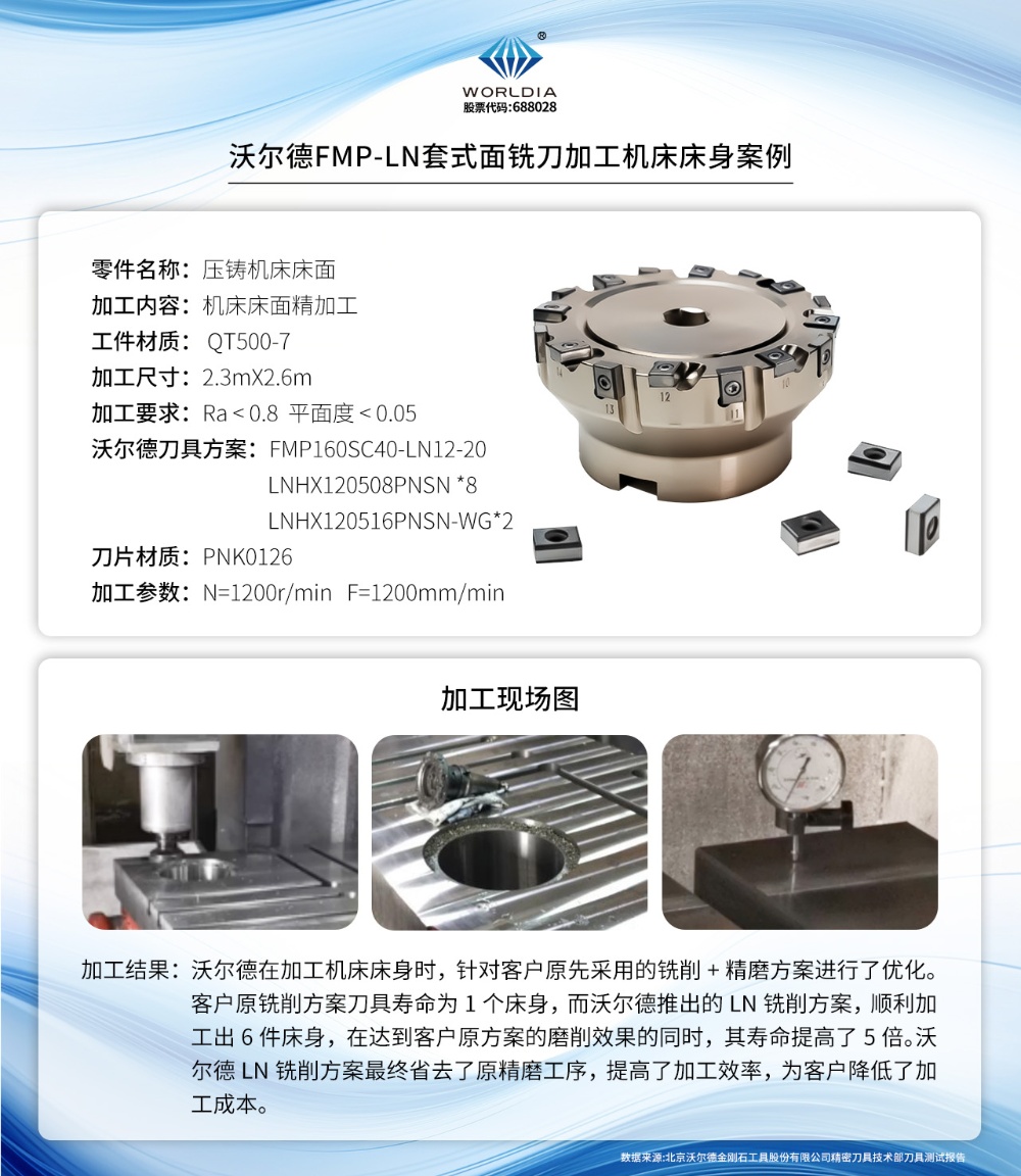 在交通運(yùn)輸、通用機(jī)械、機(jī)床制造及船舶工業(yè)等領(lǐng)域,涉及大量的鑄鐵零件的面加工,如發(fā)動(dòng)機(jī)缸體和缸蓋結(jié)合面、變速箱或齒輪箱安裝面、閥體以及機(jī)床床身等零件的平面銑削。然而,這些面銑工序常遭遇加工時(shí)間長、刀具磨損快、表面加工質(zhì)量差、刀具調(diào)節(jié)繁瑣加工難點(diǎn)。特別是針對(duì)高標(biāo)準(zhǔn)的面加工需求,傳統(tǒng)方法往往需要額外增加磨削工序,進(jìn)一步提高了加工難度與成本。為解決這些難題,北京沃爾德金剛石工具股份有限公司緊跟市場步伐,推出了高性能的FMP-LN面銑刀,以銑代磨的創(chuàng)新技術(shù),實(shí)現(xiàn)了加工效率的顯著提升與成本的有效控制。